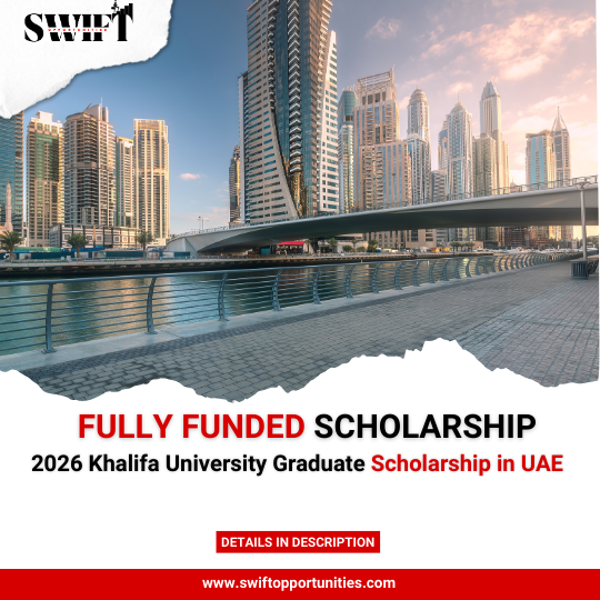 The 2026 Khalifa University Graduate Scholarship in UAE aims to attract top-performing students from across the world to join the university’s advanced research and innovation ecosystem. As a science- and technology-driven institution, Khalifa University focuses on engineering, health sciences, artificial intelligence, applied mathematics, robotics, aerospace, and sustainable technologies.